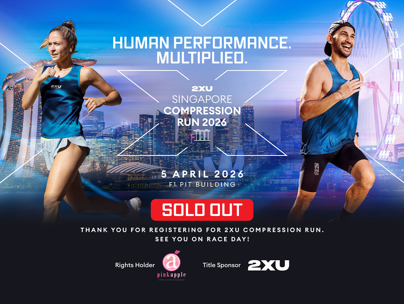 *Loyalty rate is available for past participants from any edition of 2XU Compression Run Singapore from 2019 to 2025. Please register using the same last 4 characters of NRIC/FIN or Passport number and your date of birth as per your past registration. If you encounter any registration issues, please do not proceed with registration and email singapore@2xurun.com for assistance. No refunds will be given for the price difference from the loyalty rate.