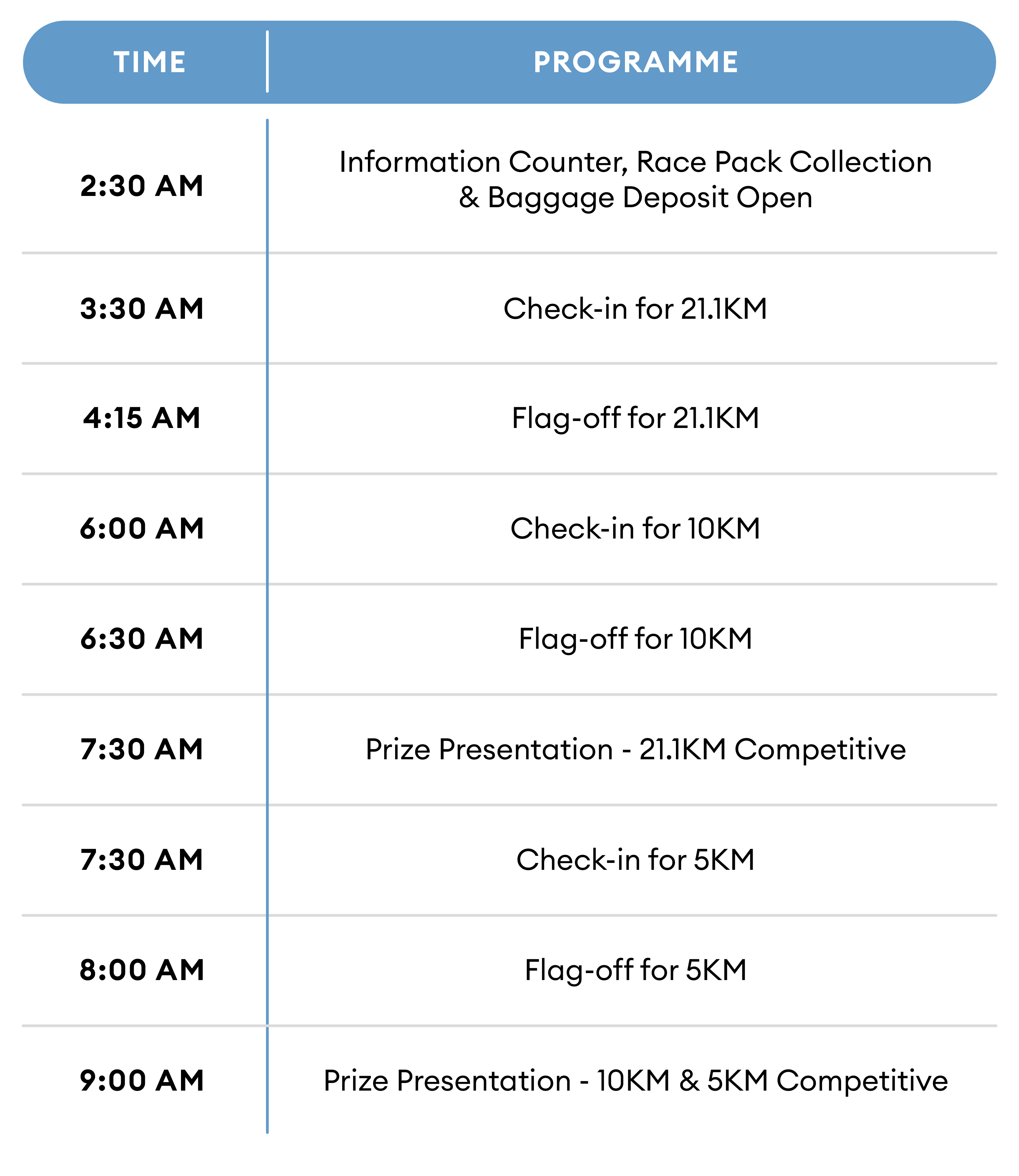 For a smooth and efficient flag-off experience, 21.1KM runners must start from their selected pens based on estimated completion time. The assigned pen will be printed on their race bib.
