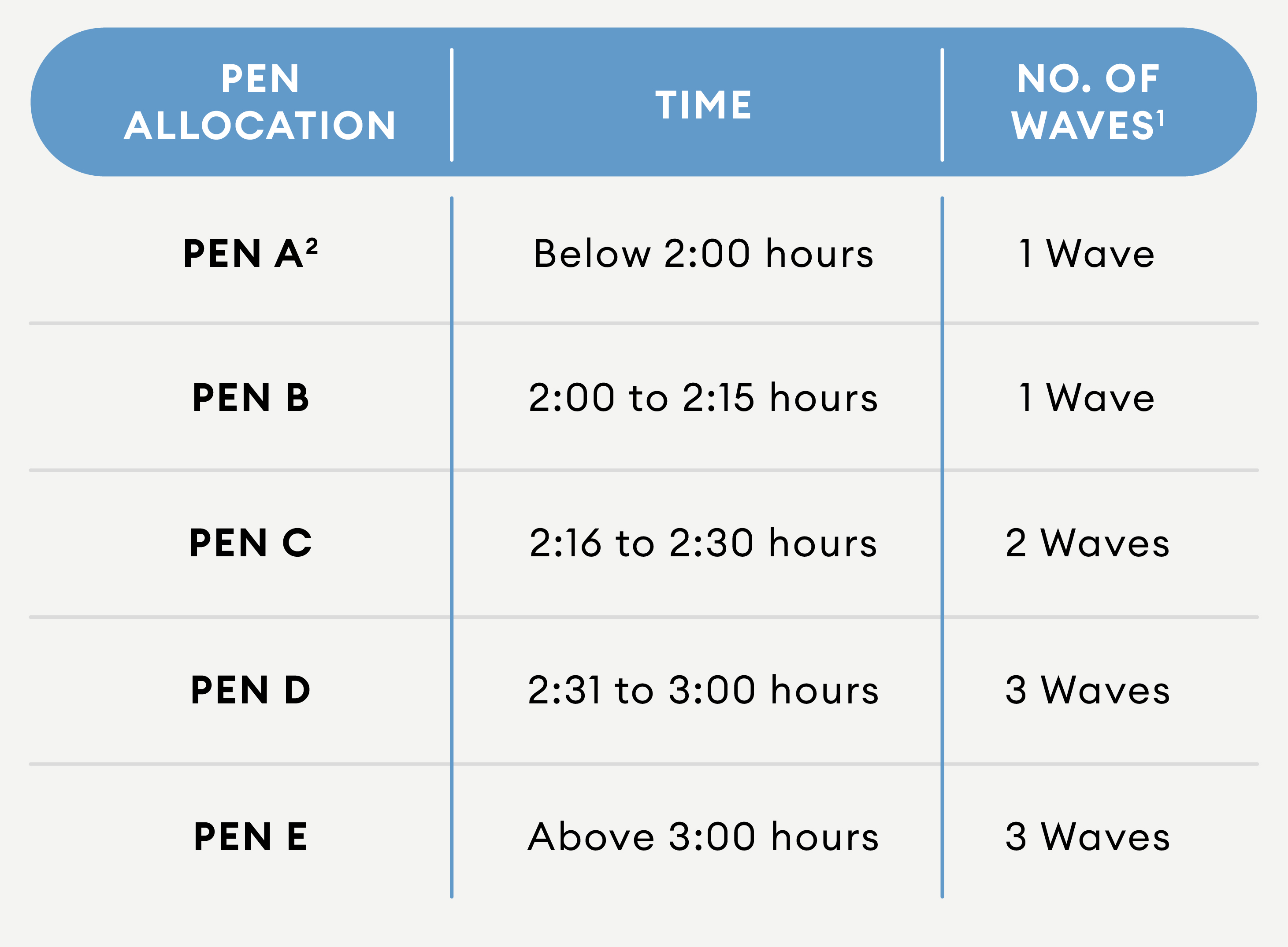 1 For Pen A & B, each wave holds a total of 2500 runners, including both male and female. Pen A is the fastest pen for the Half-Marathon. Waves allocation for Pen C, D and E is based on a first-come, first-served basis.